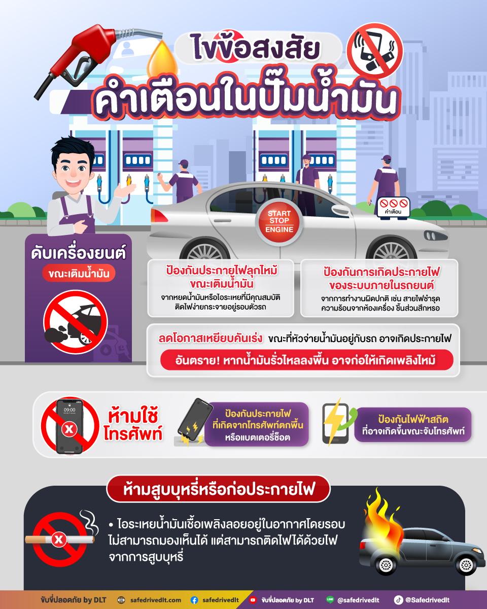 - ในระหว่างเติมน้ำมันอาจมีหยดน้ำมันหรือไอระเหยที่มีคุณสมบัติติดไฟง่ายกระจายอยู่รอบตัวรถ เสี่ยงเกิดประกายไฟลุกไหม้ขณะเติมน้ำมัน