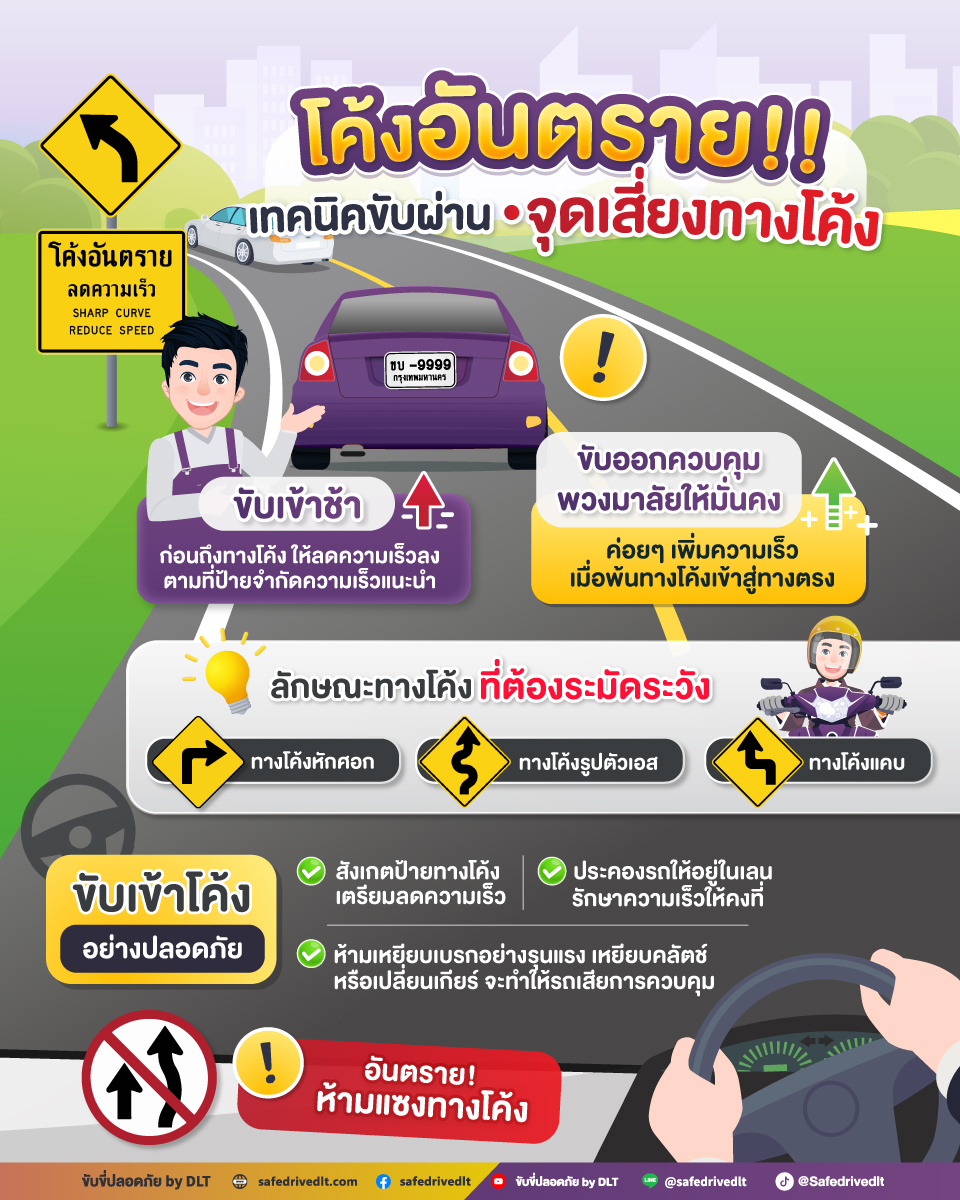1. ขับเข้าช้า ก่อนถึงทางโค้งให้ลดความเร็วลง ตามที่ป้ายจำกัดความเร็วแนะนำ และเหยียบคันเร่งโดยรักษาความเร็วให้คงที่