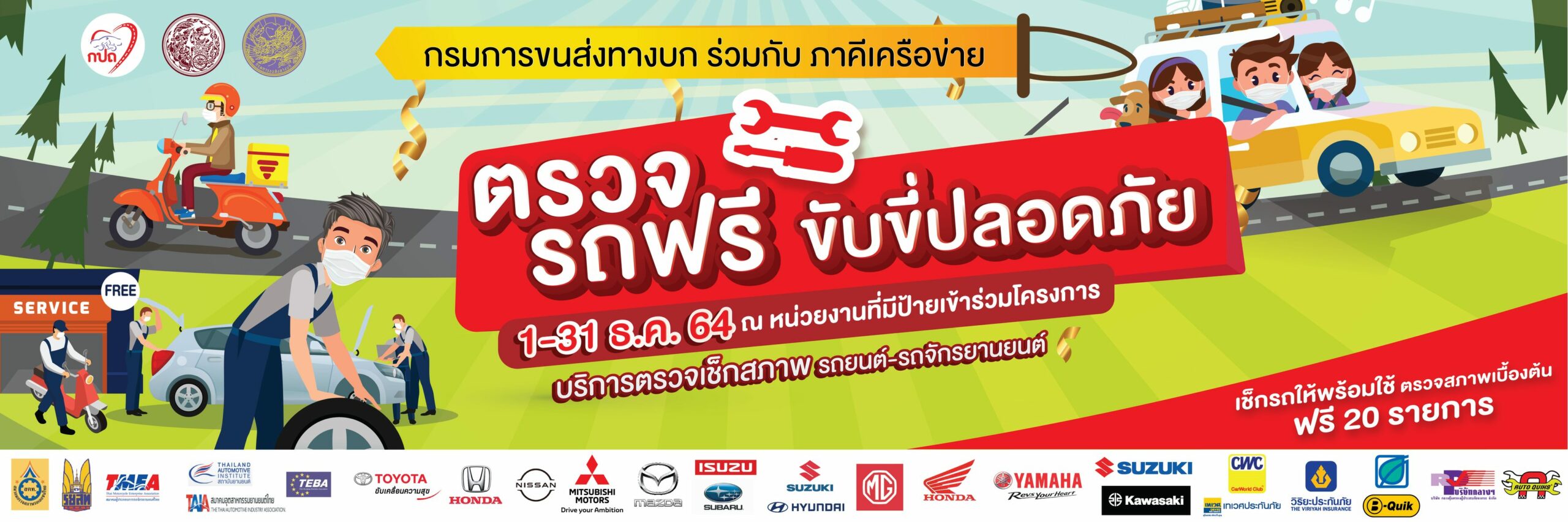 นายจิรุตม์ วิศาลจิตร อธิบดีกรมการขนส่งทางบก เปิดเผยว่า ทุกช่วงวันหยุดต่อเนื่องโดยเฉพาะเทศกาลปีใหม่ที่กำลังจะมาถึง เพื่อให้ผู้ขับขี่ตระหนักถึงความสำคัญในการเตรียมความพร้อมของรถก่อนการเดินทาง กรมการขนส่งทางบก ร่วมกับ หน่วยงานภาครัฐและเอกชนมากกว่า 20 หน่วยงาน อาทิ ผู้ผลิตและผู้แทนจำหน่ายรถยนต์ รถจักรยานยนต์ บริษัทประกันภัย สถานตรวจสภาพรถเอกชน ศูนย์บริการน้ำมัน และศูนย์บริการติดตั้งแก๊ส LPG/NGV จัดกิจกรรม “ตรวจรถฟรี ขับขี่ปลอดภัย” ตลอดเดือนธันวาคม (ระหว่างวันที่ 1-31 ธันวาคม 2564) เพื่อให้ประขาชนนำรถยนต์และรถจักรยานยนต์ทุกยี่ห้อเข้ารับบริการได้ฟรี ณ ศูนย์บริการของภาคีเครือข่ายภาครัฐและเอกชนทั่วประเทศ รวมกว่า 2,000 แห่ง ที่มีป้ายประชาสัมพันธ์ “ตรวจรถฟรี ขับขี่ปลอดภัย” โดยมีบริการตรวจเช็กสภาพรถและอุปกรณ์ส่วนควบเพื่อความปลอดภัยเบื้องต้น 20 รายการ เช่น การตรวจระบบเบรก สภาพยาง อุปกรณ์ปัดน้ำฝน ระดับน้ำมันเครื่องและความสกปรกของน้ำมันเครื่อง ระดับน้ำมันเบรกและน้ำมันคลัตช์ ความตึงของสายพาน แบตเตอรี่ และการทำงานของไฟส่องสว่าง ไฟสัญญาณต่างๆ เป็นต้น ซึ่งจะได้รับการดูแลจากช่างผู้ชำนาญงาน เพื่อให้สภาพรถพร้อมใช้งานอย่างปลอดภัยสำหรับการเดินทางไกลในเทศกาลปีใหม่นี้ นอกจากนี้ บางหน่วยงานยังมีส่วนลดค่าอะไหล่บางรายการ มีของที่ระลึก รวมไปถึงบริการอำนวยความสะดวกอื่นๆ ให้แก่เจ้าของรถอีกด้วย