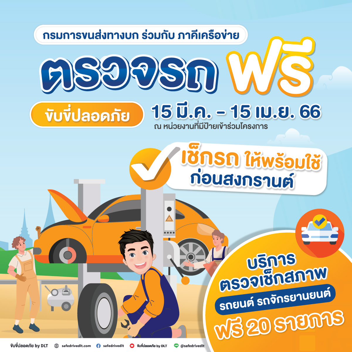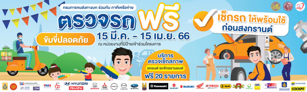 กรมการขนส่งทางบก ร่วมกับหน่วยงานภาครัฐและเอกชน ชวนเช็กรถให้พร้อมใช้ก่อนสงกรานต์ กับกิจกรรม “ตรวจรถฟรี ขับขี่ปลอดภัย” ให้ประชาชนนำรถยนต์-รถจักรยานยนต์เข้าตรวจเช็กสภาพรถและอุปกรณ์ส่วนควบฟรี 20 รายการ ตลอด 15 มี.ค. – 15 เม.ย. 2566 ณ ศูนย์บริการของภาคีเครือข่ายภาครัฐและเอกชนทั่วประเทศ รวมกว่า 2,000 แห่ง ที่มีป้ายประชาสัมพันธ์ “ตรวจรถฟรี ขับขี่ปลอดภัย”