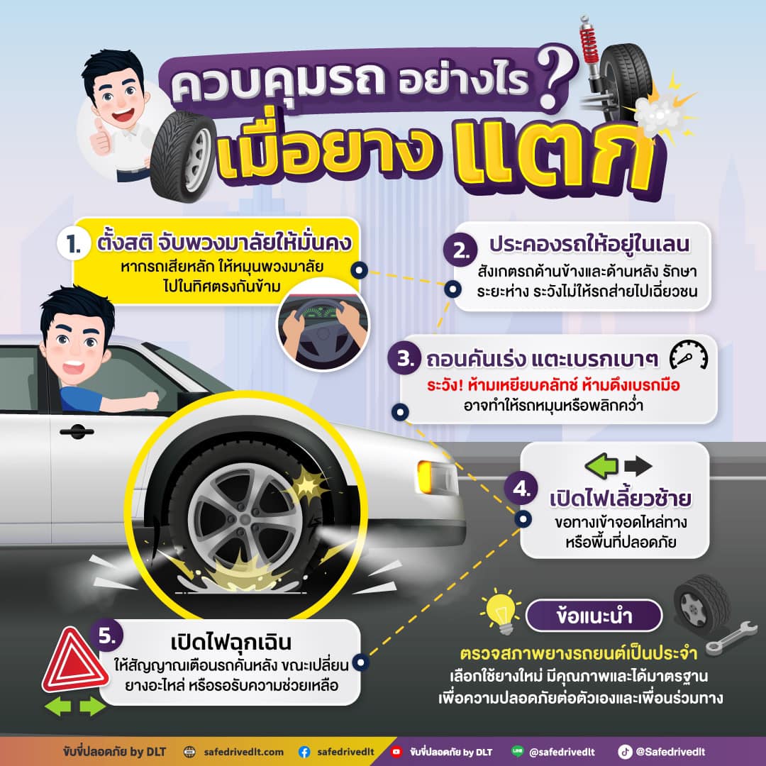 - ตั้งสติ จับพวงมาลัยให้มั่นคง หากรถเสียหลัก ให้หมุนพวงมาลัยไปในทิศตรงกันข้าม