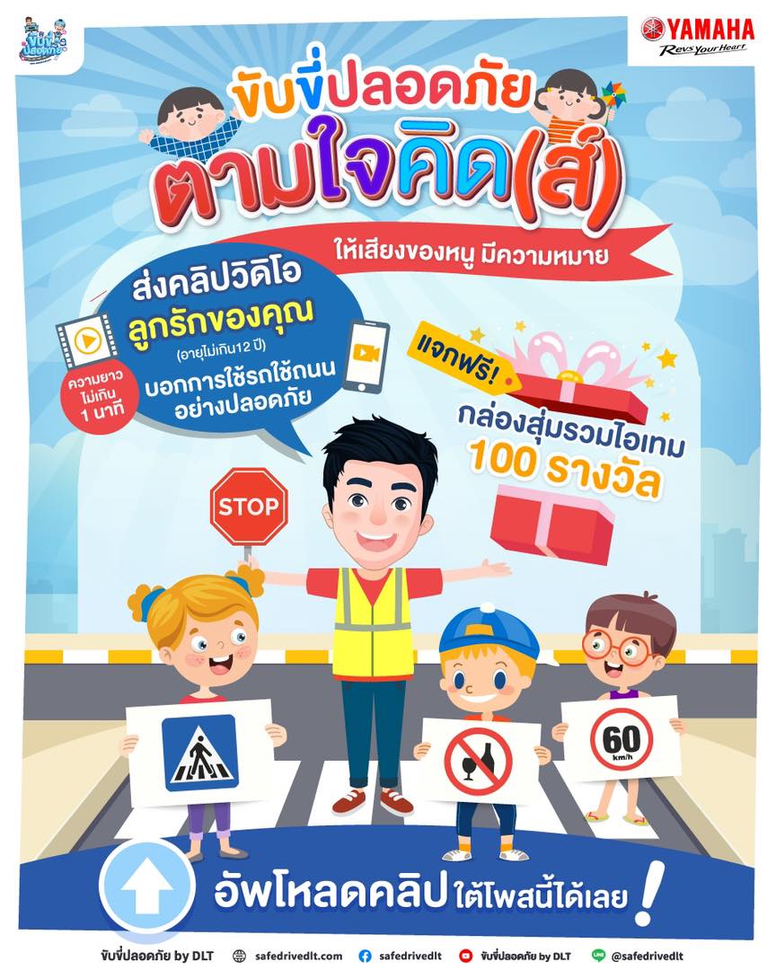วันเด็กแห่งชาติ 14 มกราคม 2566 ขับขี่ปลอดภัย by DLT ร่วมกับ บริษัท ไทยยามาฮ่ามอเตอร์ จำกัด จัดกิจกรรมส่งเสริมความปลอดภัยทางถนน ขับขี่ปลอดภัย ตามใจคิด(ส์) ให้เสียงของหนูมีความหมาย เชิญชวนเด็กๆ บอกการใช้รถใช้ถนนอย่างปลอดภัย ผ่านคลิปวิดีโอความยาวไม่เกิน 1 นาที และมีของขวัญมอบให้เด็กๆ เป็นกล่องสุ่มรวมไอเทมน่ารักๆ โดยคุณพ่อคุณแม่ของน้องๆ ได้อัพโหลดคลิปวิดีโอในโพสกิจกรรม Facebook Fanpage ขับขี่ปลอดภัย by DLT