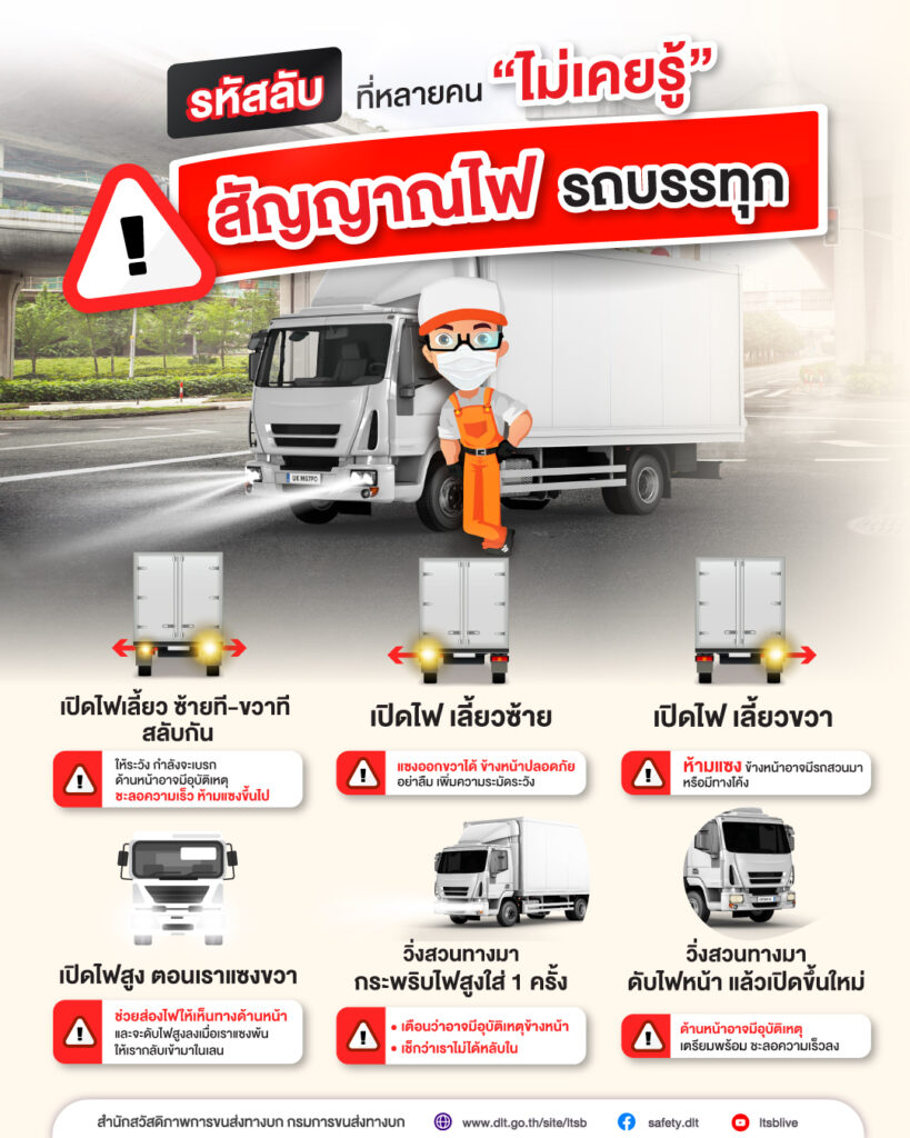 สัญญาณไฟของรถบรรทุกเหล่านี้ บางคนอาจจะไม่รู้มาก่อน ดังนั้น ควรทำเข้าใจการส่งรหัสสัญญาณไฟในลักษณะต่างๆ เพราะหากเราเข้าใจการสื่อสารบนท้องถนนตรงกัน ก็จะช่วยให้ขับขี่กันอย่างปลอดภัยมากขึ้นทั้งตัวคุณและเพื่อนร่วมทาง