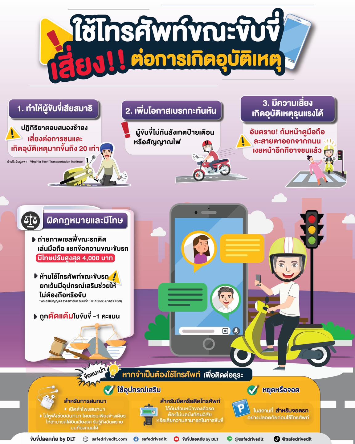การใช้โทรศัพท์มือถือขณะขับขี่รถจักรยานยนต์ กำลังเป็นภาพที่พบเห็นได้ทั่วไป แต่เป็นเรื่องอันตรายอย่างยิ่ง เพราะการใช้โทรศัพท์มือถือขณะขับขี่และซ้อนท้าย เป็นอีกปัจจัยที่ทำให้เกิดอุบัติเหตุจนถึงขั้นบาดเจ็บ พิการและเสียชีวิตสูงขึ้น