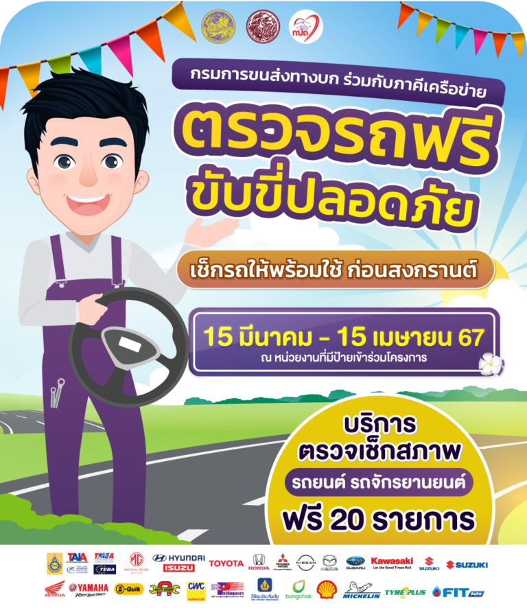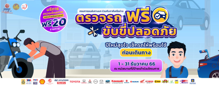 กิจกรรม ตรวจรถฟรี ขับขี่ปลอดภัย 1-31 ธันวาคม 2567 ณ ศูนย์บริการของภาคีเครือข่ายภาครัฐและเอกชนทั่วประเทศ รวมกว่า 2,000 แห่ง ที่มีป้ายประชาสัมพันธ์ธันวาคม 3, 2024