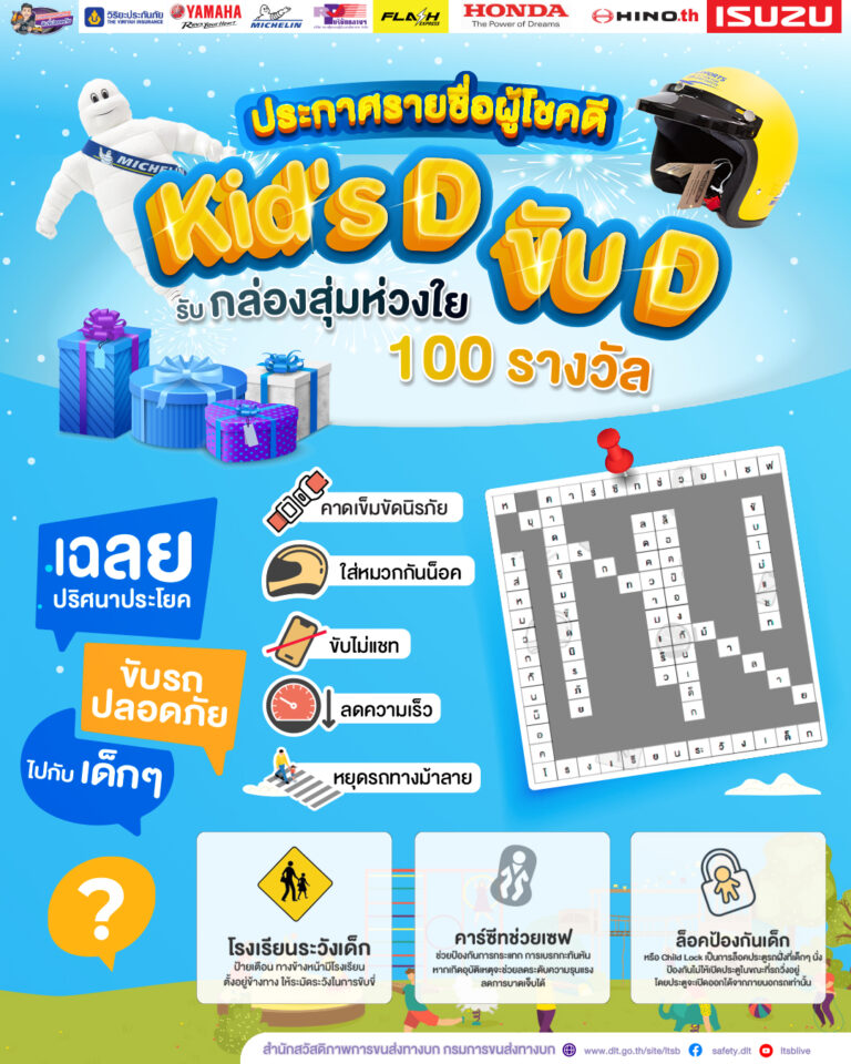 กิจกรรม กิจกรรม Kids’D ขับ D ขับขี่ปลอดภัย ชวนเล่นเกม “ขับรถปลอดภัย ไปกับเด็กๆ” ประกาศผลผู้โชคดีรับกล่องสุ่ม 100 รางวัลมกราคม 20, 2022มกราคม 21, 2022