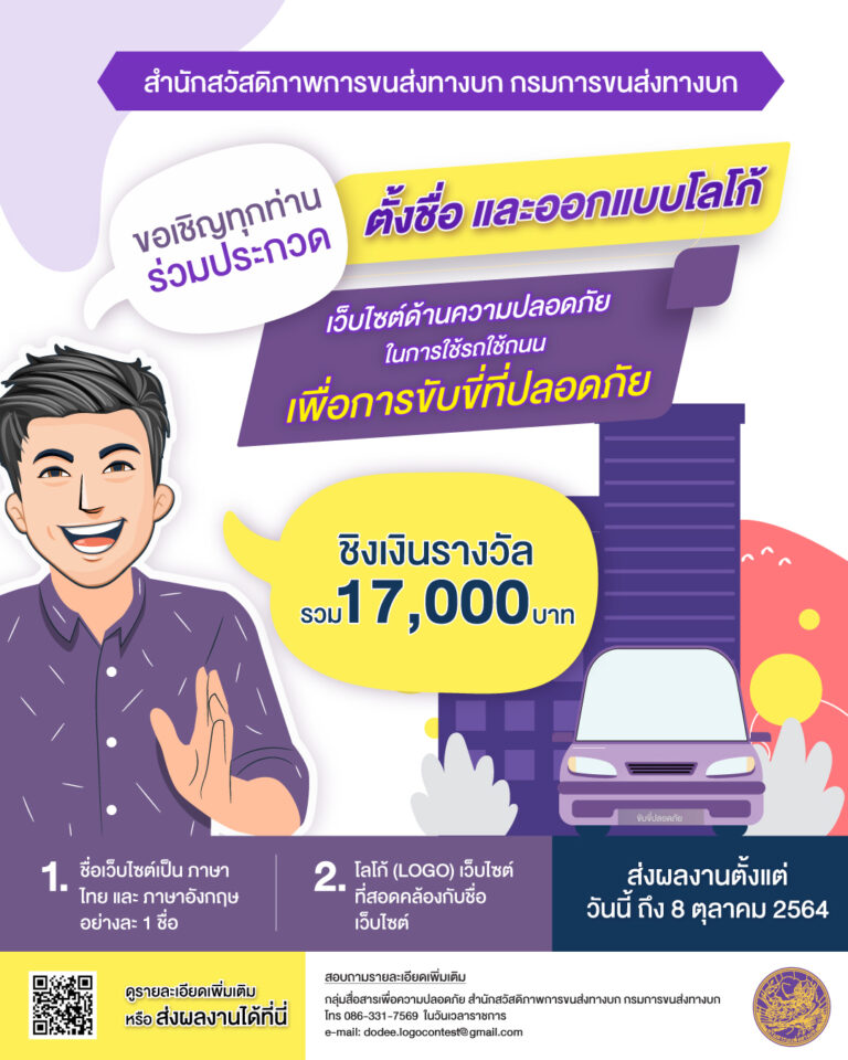 กิจกรรม กิจกรรมประกวดชื่อและออกแบบโลโก้ (LOGO) เว็บไซต์ด้านความปลอดภัยในการใช้รถใช้ถนน ชิงเงินรางวัล รวมมูลค่า 17,000 บาทกันยายน 20, 2021กันยายน 7, 2025